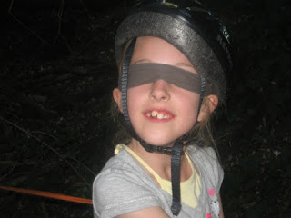 We did the night line and I looked a zombie. We had to have a blindfold on and a helmet, so we could not see. The helmet was on because we could bump into trees. There was an orange ribbon we had to follow to the end of the bush. We went in a net too. I bumped into a tree! It hurt my hand. In the bush it smelt like pine.